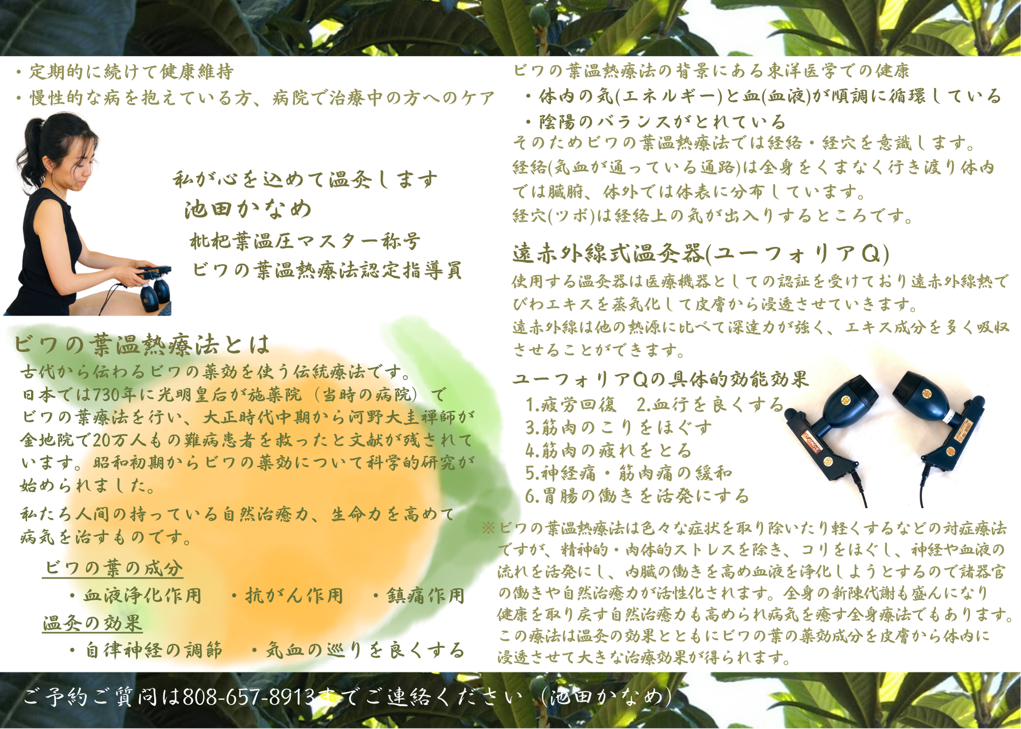 当サロンBIWAはハワイで唯一ビワ温灸(ビワの葉温熱療法)を取り入れています。